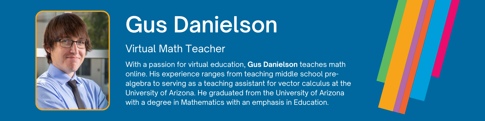 Gus Danielson teaches math online, focused on creating learning experiences that keep students mentally active from start to finish. He builds his lessons around inquiry and step-by-step exploration and always gives students opportunities to share their thinking.