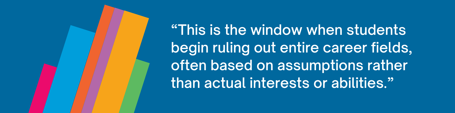 Research shows students start narrowing career options between ages 9 and 13—long before most receive formal guidance—and confirms that this is when students rule out entire fields based on assumptions like “that’s not for people like me.”