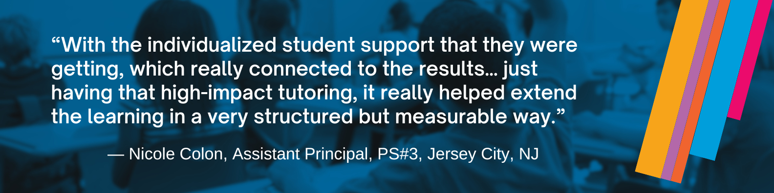 “With the individualized student support that they were getting, which really connected to the results… just having that high-impact tutoring, it really helped extend the learning in a very structured but measurable way.” — Nicole Colon, Assistant Principal, PS#3, Jersey City, NJ