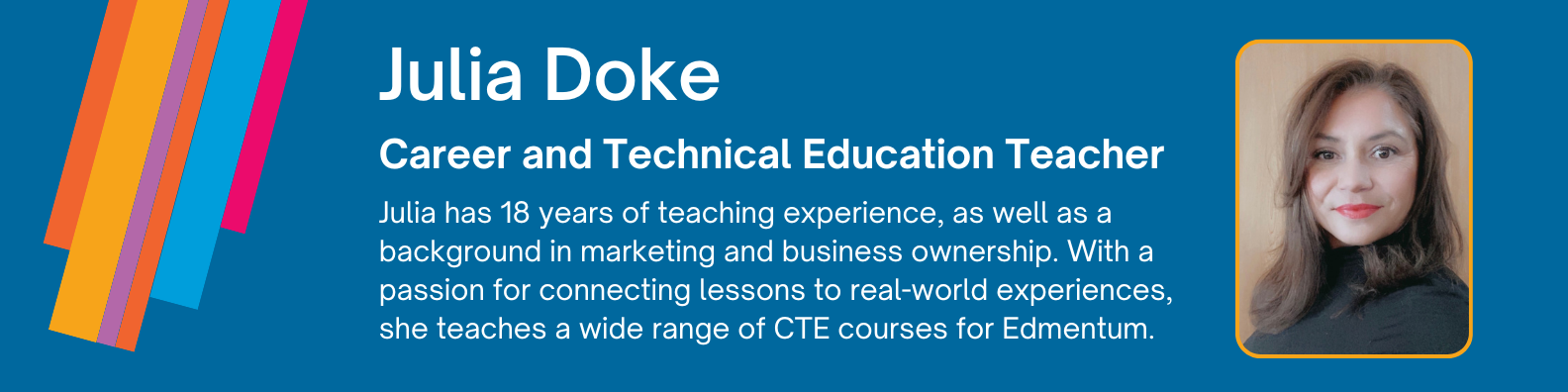 Julia Doke has nearly two decades of teaching experience in a wide array of subject areas. “I am passionate about building strong relationships, connecting lessons to real life, and helping students achieve those ‘light bulb’ moments of understanding” she says.