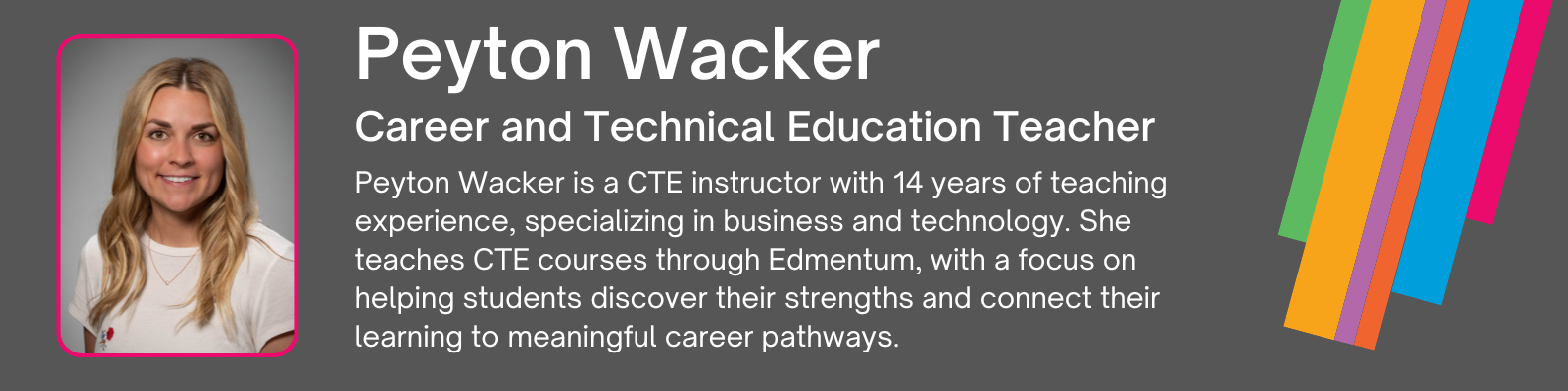 Peyton Wacker, now in her 14th year as a CTE teacher, spent eight years in a traditional classroom before transitioning to online instruction, giving her a front-row seat to the benefits of digital flexibility.