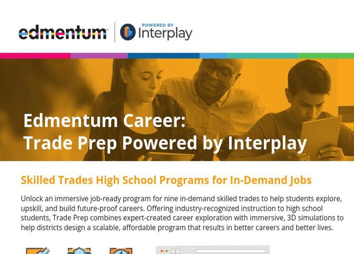 Unlock an immersive job-ready program for nine in-demand skilled trades to help students explore, upskill, and build future-proof careers. Offering industry-recognized instruction to high school students, Trade Prep combines expert-created career exploration with immersive, 3D simulations to help districts design a scalable, affordable program that results in better careers and better lives.